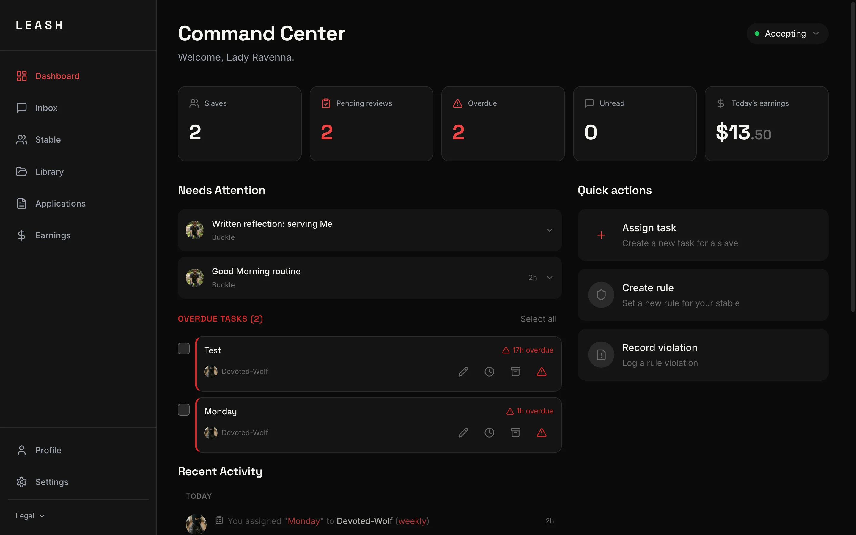 - Stable Management dashboard — the full overview with all your slaves, tasks, and activity in one view
