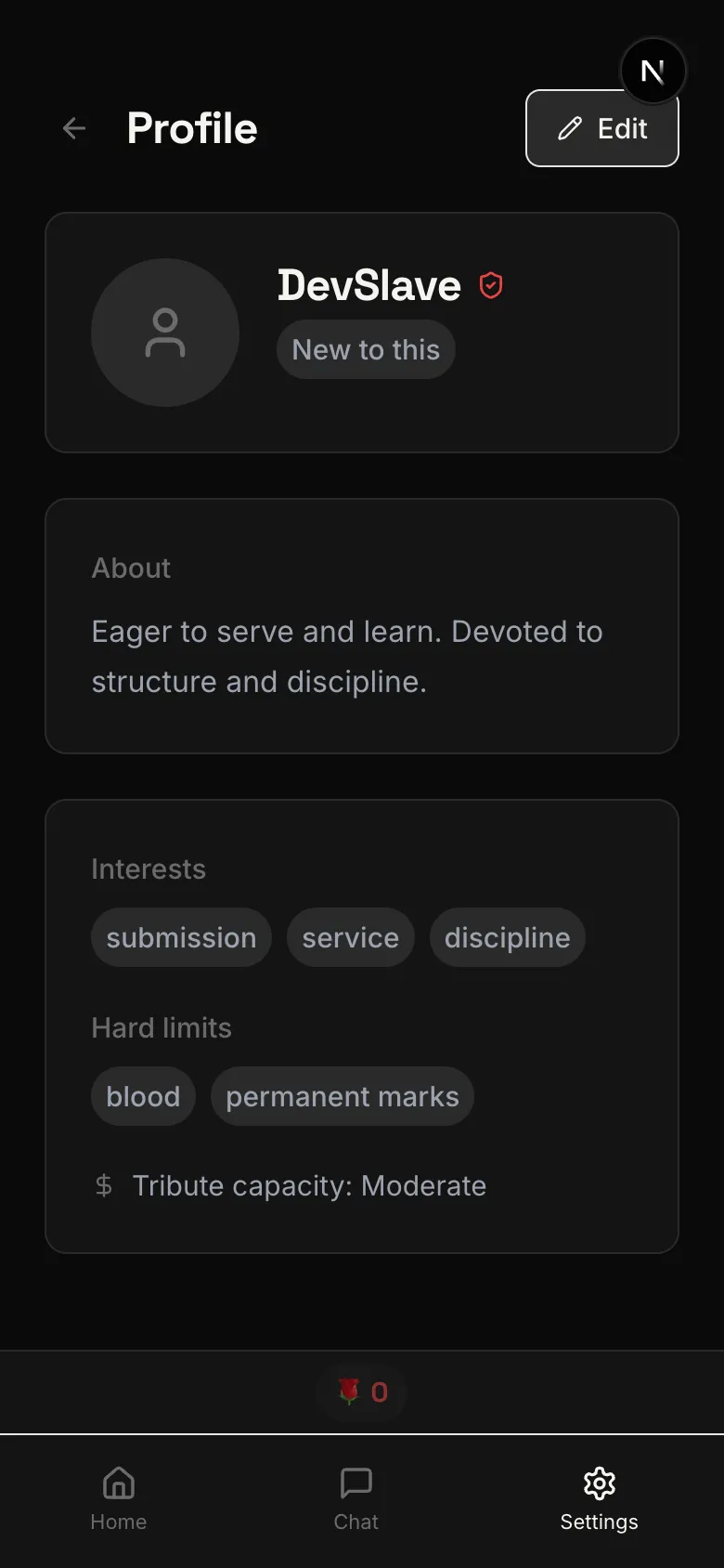 Your profile is the first thing other users see. A complete, well-crafted profile significantly increases engagement — whether you're a Mistress looking to attract devoted slaves or a slave looking to connect with the right Mistress.